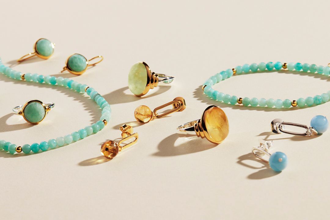 NAJO’s 2024 Event Edit fuses sculptural statement pieces and vivid gemstones with pared-back designs that can be layered for opulent looks. The Edit introduces the exquisite Stargazer Black Onyx and Azzurro Amazonite designs, featuring bracelet and necklace gemstone strands with accents of glittering gold and matching cabochon rings.