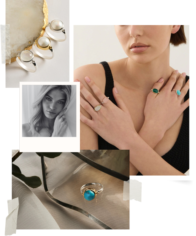 Discover the Enchantress Turquoise Ring, Fleur Rose Quartz Ring or the Garland Moonstone Ring for captivating beauty.